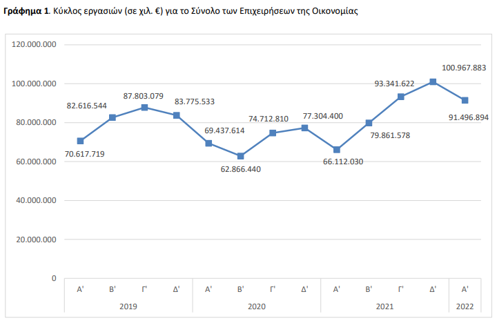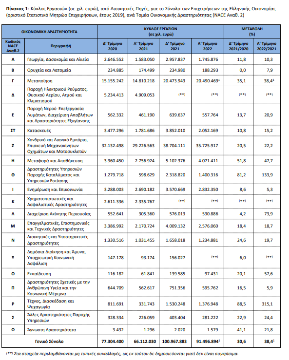 Ειδικότερα, για το σύνολο των επιχειρήσεων και των δραστηριοτήτων της οικονομίας, ο κύκλος εργασιών το πρώτο τρίμηνο 2022 ανήλθε σε 91.496.8941 χιλ. ευρώ, σημειώνοντας αύξηση 38,4% σε σχέση με το πρώτο τρίμηνο 2021, που είχε ανέλθει σε 66.112.030 χιλ. ευρώ. Τη μεγαλύτερη αύξηση στον κύκλο εργασιών το πρώτο τρίμηνο 2022 σε σύγκριση με το πρώτο τρίμηνο 2021 παρουσίασαν οι επιχειρήσεις του τομέα Τέχνες, Διασκέδαση και Ψυχαγωγία κατά 315,1%, ενώ τη μικρότερη αύξηση στον κύκλο εργασιών το πρώτο τρίμηνο 2022 σε σύγκριση με το πρώτο τρίμηνο 2021 παρουσίασαν οι επιχειρήσεις του τομέα Ενημέρωση και Επικοινωνία, κατά 5,3%.