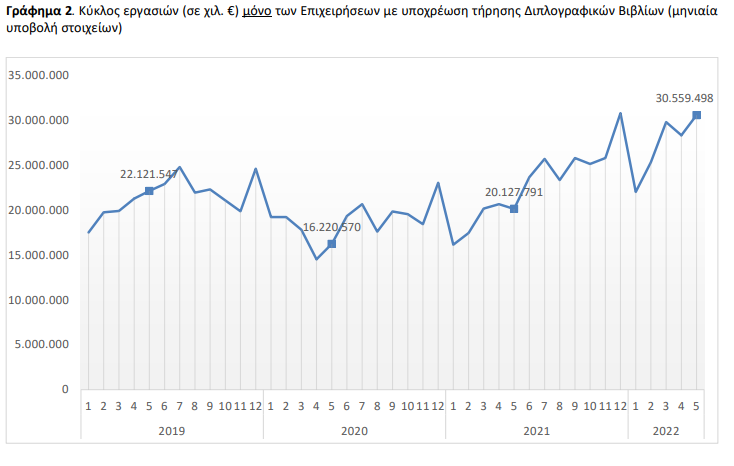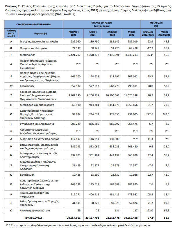 Για το σύνολο των επιχειρήσεων της οικονομίας με υποχρέωση τήρησης διπλογραφικών βιβλίων, για τις οποίες υπάρχουν διαθέσιμα στοιχεία σε μηνιαία βάση, ο κύκλος εργασιών τον Μάιο 2022 ανήλθε σε 30.559.498 χιλ. ευρώ, σημειώνοντας αύξηση 51,8% σε σχέση με τον Μάιο 2021, που είχε ανέλθει σε 20.127.791 χιλ. ευρώ. Τη μεγαλύτερη αύξηση στον κύκλο εργασιών τον Μάιο 2022 σε σύγκριση με τον Μάιο 2021 παρουσίασαν οι επιχειρήσεις του τομέα Δραστηριότητες Υπηρεσιών Παροχής Καταλύματος και Υπηρεσιών Εστίασης κατά 242,0%, ενώ τη μικρότερη αύξηση στον κύκλο εργασιών τον Μάιο 2022 σε σύγκριση με τον Μάιο 2021 παρουσίασαν οι επιχειρήσεις του τομέα Δραστηριότητες Σχετικές με την Ανθρώπινη Υγεία και την Κοινωνική Μέριμνα, κατά 5,3%.