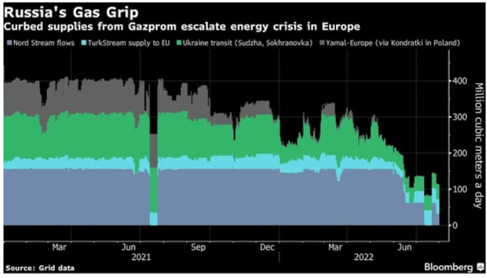 Οι περιορισμοί έχουν οδηγήσει τις τιμές στο υψηλότερο επίπεδο από τις αρχές Μαρτίου, τις πρώτες εβδομάδες του πολέμου στην Ουκρανία. Οι αυξανόμενοι λογαριασμοί ενέργειας έχουν πυροδοτήσει τον πληθωρισμό, απειλώντας να οδηγήσουν χώρες της Ευρώπης σε ύφεση, καθώς αυτές σπεύδουν να αποθηκεύσουν φυσικό αέριο ενόψει του χειμώνα.