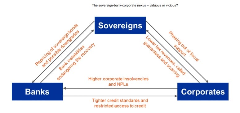 Σε ομιλία της με τίτλο «The sovereign-bank-corporate nexus – virtuous or vicious?», η Ιζαμπέλ Σνάιμπελ, μέλος της Εκτελεστικής Επιτροπής του ΔΣ της ΕΚΤ, αναφέρει ότι δεδομένου ότι καθώς η βιωσιμότητα των επιχειρήσεων έχει εξαρτηθεί περισσότερο από τη στήριξη μέσων κρατικών κονδυλίων, τυχόν απόσυρση του κράτους από τα προγράμματα στήριξης θα μπορούσε να προκαλέσει προβλήματα στις επιχειρήσεις, ταχεία αύξηση των μη εξυπηρετούμενων δανείων (NPL) και αυστηρότερες προϋποθέσεις χρηματοδότησης.