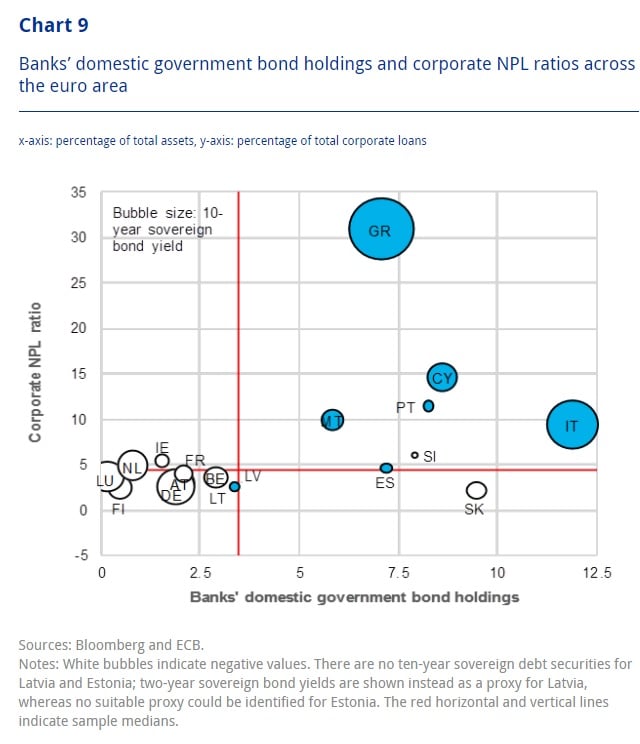 Για παράδειγμα, απορροφώντας μέρος του πρόσφατα εκδοθέντος κρατικού χρέους, οι τράπεζες έχουν αυξήσει τα ανοίγματα έναντι της γενικής κυβέρνησης σε πολλές χώρες της ζώνης του ευρώ, ενισχύοντας τους δεσμούς μεταξύ κράτους και τραπεζών.