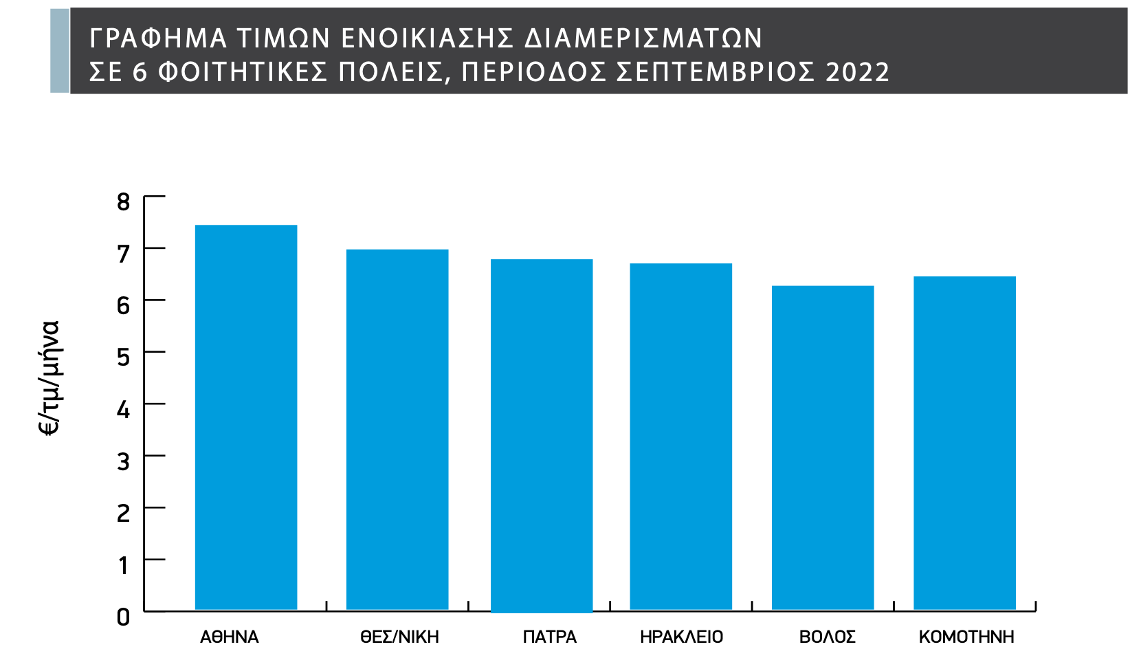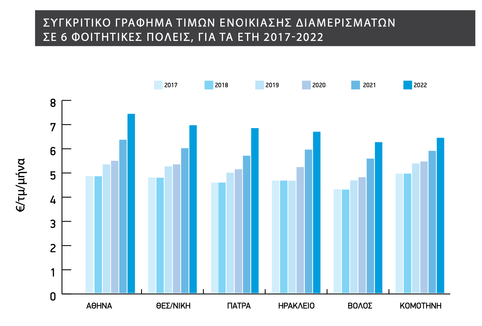 Η Αθήνα είναι η πόλη με της υψηλότερες τιμές μίσθωσης φοιτητικών κατοικιών, καταγράφοντας εντυπωσιακή αύξηση ενοικίων την τελευταία πενταετία, που φθάνει στο 53,10%! Στον αντίποδα, ο Βόλος είναι η φοιτητούπολη με τις χαμηλότερες τιμές ενοικίασης τυπικών, παλαιών, φοιτητικών διαμερισμάτων.