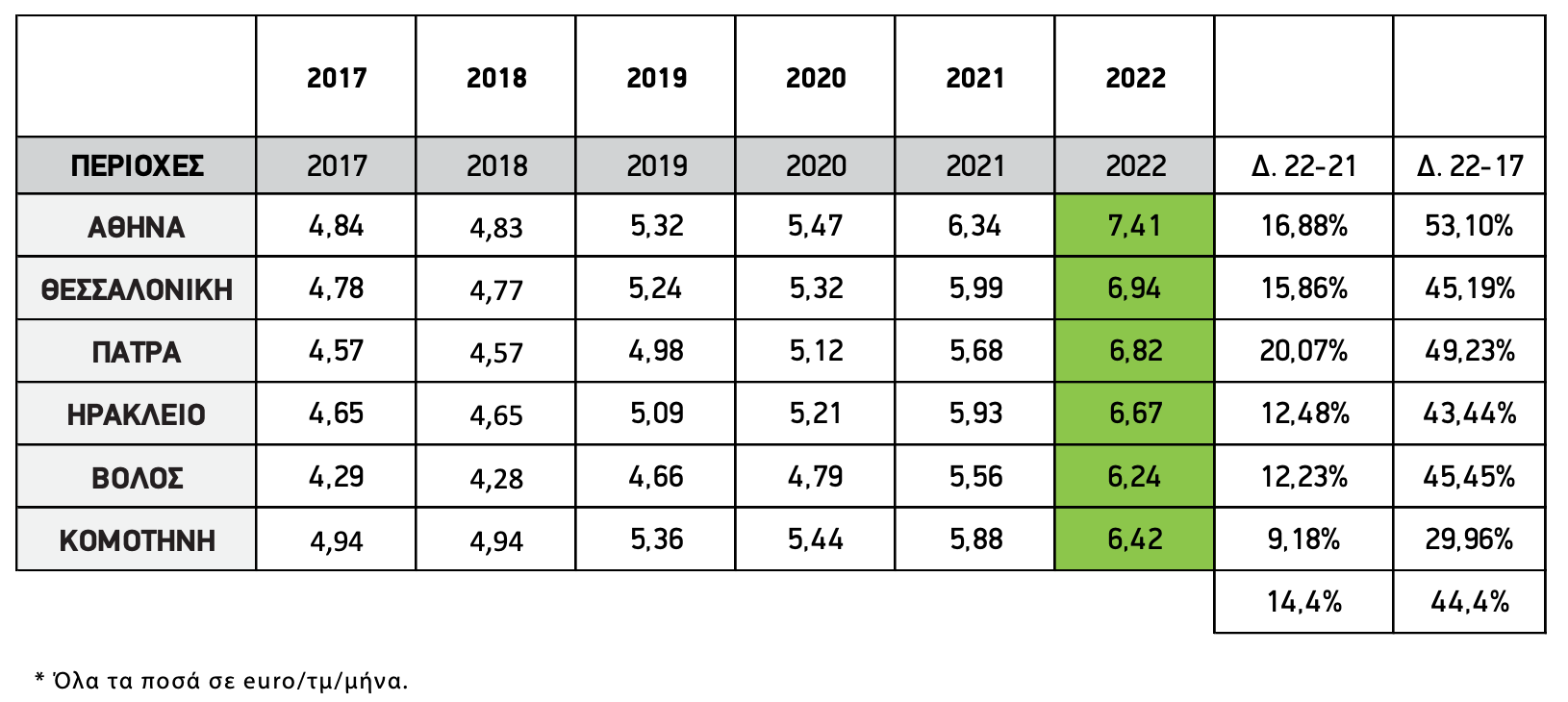Σε σχέση με τον Σεπτέμβριο 2017, οι ζητούμενες τιμές αυξήθηκαν μεσοσταθμικά σε όλη την Ελλάδα, σε ποσοστό 44,4%. Το επίπεδο της αύξησης των ζητούμενων μισθωμάτων σε σχέση με πέρσι (2021) είναι διψήφιο και προσδιορίζεται μεσοσταθμικά στο 14,4%, σύμφωνα με έρευνα από την εταιρεία πιστοποιημένων εκτιμητών, Geoaxis.