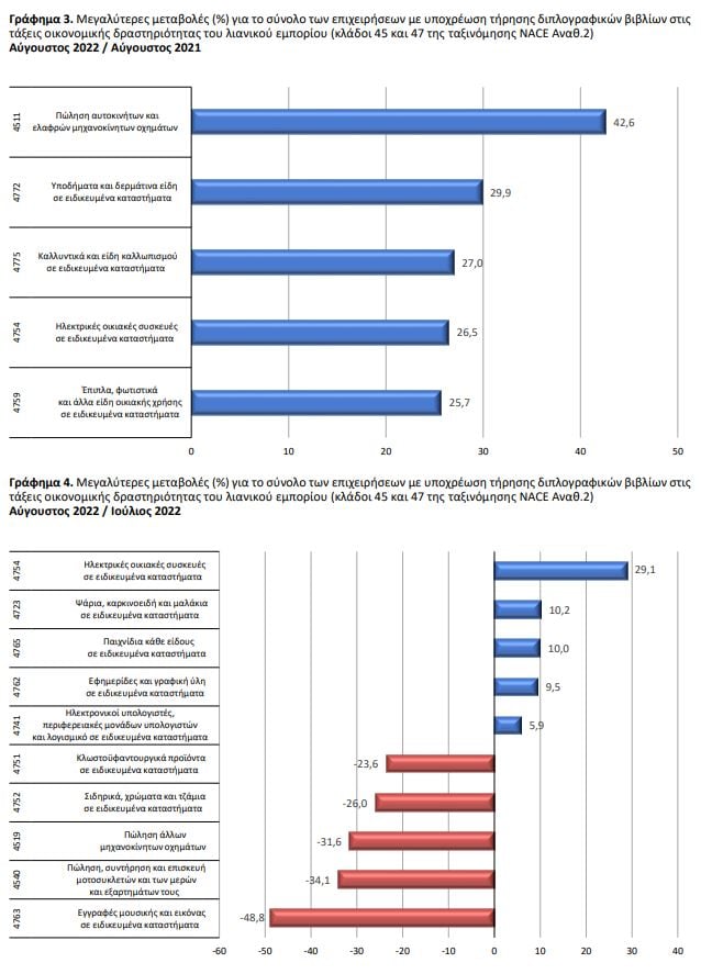 Εξάλλου, για τις επιχειρήσεις του λιανικού εμπορίου, με εξαίρεση τα οχήματα, τα τρόφιμα και τα καύσιμα, με υποχρέωση τήρησης διπλογραφικών βιβλίων και για τις οποίες υπάρχουν διαθέσιμα στοιχεία σε μηνιαία βάση, ο κύκλος εργασιών τον Αύγουστο 2022 ανήλθε σε 0,91 δισ. ευρώ, σημειώνοντας αύξηση 19,3% σε σχέση με τον Αύγουστο 2021 που είχε διαμορφωθεί σε 0,77 δισ. ευρώ. Ενώ, υπήρξε μείωση 5,9% σε σχέση με τον Ιούλιο 2022 που είχε διαμορφωθεί σε 0,97 δισ. ευρώ.