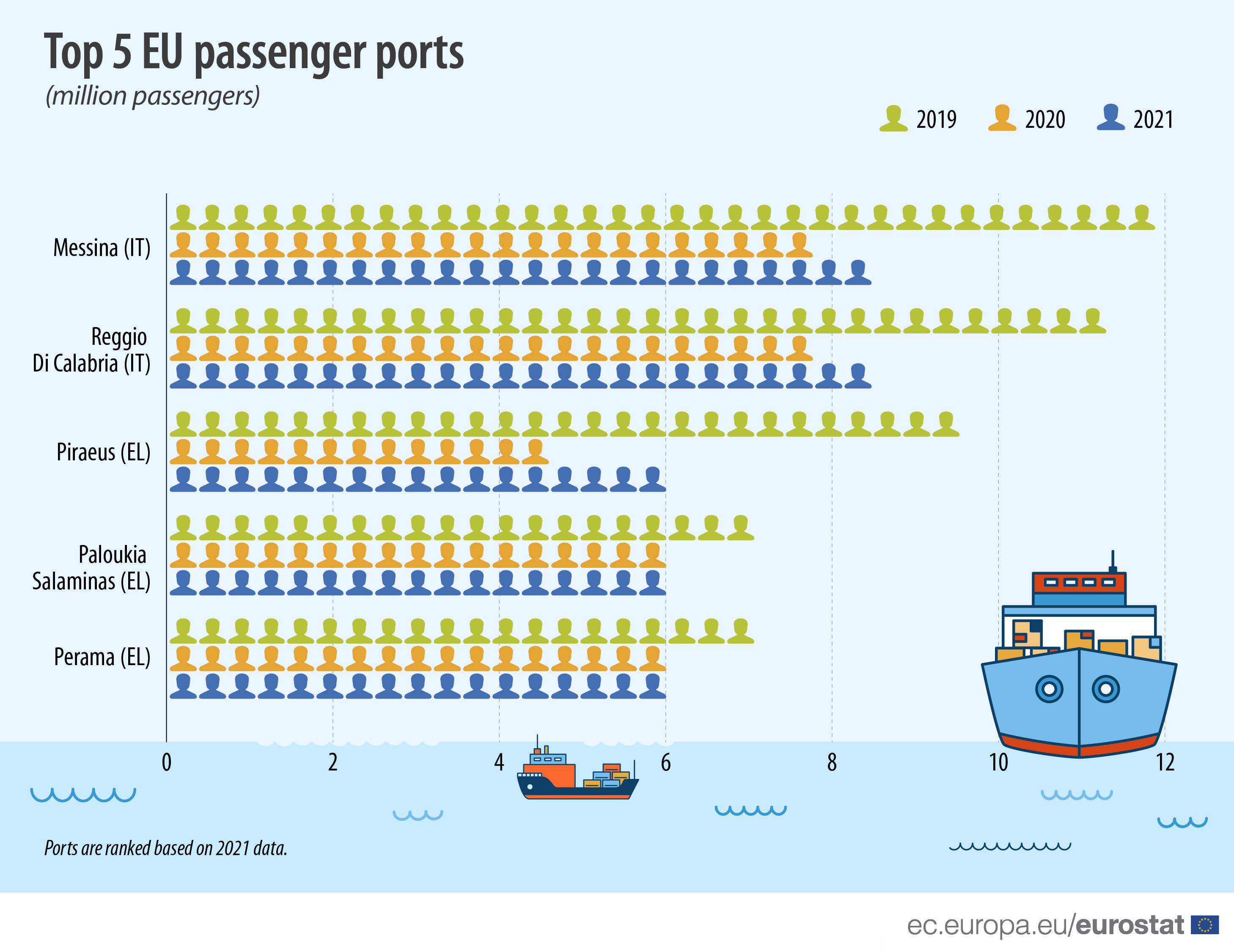 Το λιμάνι της Μεσσήνης στην Ιταλία παρέμεινε το μεγαλύτερο επιβατικό λιμάνι της ΕΕ το 2021, με 8,3 εκατομμύρια επιβάτες. Στη λίστα ακολουθούν το Reggio Di Calabria στην Ιταλία (8,1 εκατομμύρια επιβάτες) και τρία ελληνικά λιμάνια: ο Πειραιάς, τα Παλούκια Σαλαμίνας και το Πέραμα (με 5,9 εκατομμύρια επιβάτες το καθένα).