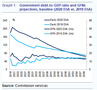 Ειδικότερα, η έκθεση σημειώνει τα εξής: «Παρά την επιδείνωση των βραχυπρόθεσμων προοπτικών, το βασικό σενάριο δείχνει μία επάνοδο σε καθοδική πορεία του λόγου χρέους - ΑΕΠ. Η πανδημία αναμένεται να έχει μεγάλο αντίκτυπο στο δημόσιο χρέος της Ελλάδας, το οποίο προβλέπεται να αυξηθεί από το 180,5% του ΑΕΠ το 2019 σε πάνω από το 207% το 2020. Ωστόσο, καθώς τα έκτακτα δημοσιονομικά μέτρα σχετικά με την πανδημία αναμένεται να είναι προσωρινά και η οικονομία προβλέπεται να αρχίσει να ανακάμπτει το 2021, ο λόγος χρέους – ΑΕΠ αναμένεται να ακολουθήσει πτωτική τάση από το 2021. Ωστόσο, θα παρέμενε σε υψηλά επίπεδα, πάνω από το 120% του ΑΕΠ έως το 2040, αντανακλώντας τις επιδεινωμένες βραχυπρόθεσμες και μεσοπρόθεσμες προοπτικές σε σύγκριση με την ανάλυση DSA για το 2019, όταν το ποσοστό του χρέους αναμενόταν να κινείται μόνο πάνω από το 100% σε αυτό το χρονικό σημείο. Το 2060, ο λόγος του χρέους αναμένεται να κινείται στα ίδια περίπου επίπεδα με αυτά της DSA του 2019, στηριζόμενος από τις αναμενόμενες ευνοϊκές χρηματοδοτικές συνθήκες μεσοπρόθεσμα και υψηλότερους ρυθμούς ανάπτυξης μακροπρόθεσμα σε σχέση με τη DSA του 2019, όπως δείχνει το γράφημα (graph 1)».