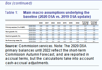 Οσον αφορά τις βασικές μακροοικονομικές παραδοχές (πίνακας 1), η Κομισιόν θεωρεί ότι η ανάπτυξη στη δεκαετία 2020-29 θα είναι χαμηλότερη σε σχέση με την πρόβλεψη του 2019 και το πρωτογενές έλλειμμα υψηλότερο, αλλά από την άλλη πλευρά προβλέπει πολύ μικρότερο κόστος χρηματοδότησης. Συγκεκριμένα, ο μέσος ετήσιος ρυθμός αύξησης του πραγματικού ΑΕΠ προβλέπεται στο 0,6% από 1,4% και το μέσο πρωτογενές πλεόνασμα ως ποσοστό του ΑΕΠ μόνο 0,7% αντί του 2,6% που αναμενόταν το 2019. Από την άλλη πλευρά, το μέσο ετήσιο επιτόκιο εξυπηρέτησης του χρέους τη δεκαετία 2020-2029 εκτιμάται στο 1,8% από 3,9%.