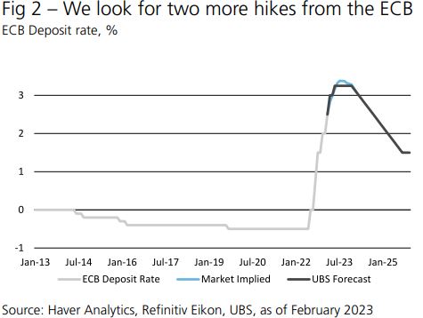 Η UBS εκτιμά ότι μετά τις αυξήσεις των επιτοκίων κατά 300 μονάδες βάσης (τρεις ποσοστιαίες μονάδες), η Ευρωπαϊκή Κεντρική Τράπεζα θα προχωρήσει σε μία ακόμη αύξηση 50 μ.β. τον Μάρτιο, όπως την προανήγγειλε η Κριστίν Λαγκάρντ και σε μία περαιτέρω αύξηση, πιθανόν 25 μ.β. τον Μάιο, με την οποία θα κλείσει ο ανοδικός κύκλος.