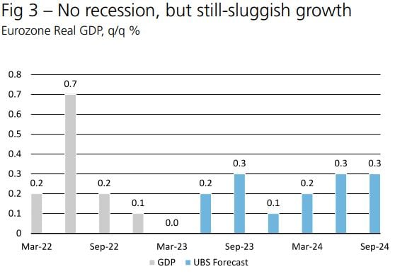 Αλλαγή πολιτικής της ΕΚΤ, δηλαδή μείωση των επιτοκίων της, η UBS βλέπει από το α’ τρίμηνο του 2024, όταν τα στελέχη της θα έχουν μεγαλύτερη ασφάλεια για τη μείωση του πληθωρισμού προς τον στόχο του 2%. Οι μειώσεις των επιτοκίων προβλέπεται να γίνουν με σταθερά βήματα των 25 μ.β. κάθε τρίμηνο έως ότου υποχωρήσουν στο 1,5% το 2025.
