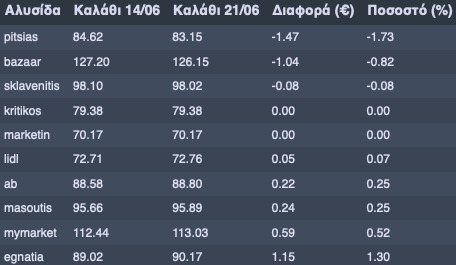 Στον παρακάτω πίνακα φαίνεται το κόστος του «Καλαθιού του Νοικοκυριού» ανά σούπερ μάρκετ και η μεταβολή του από την 33η στην 34η εβδομάδα: