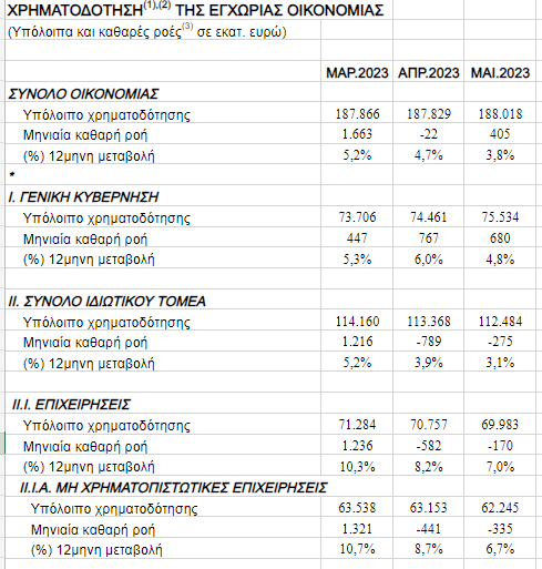 Το Μάιο του 2023, o ετήσιος ρυθμός μεταβολής της συνολικής χρηματοδότησης του ιδιωτικού τομέα μειώθηκε σε 3,1% από 3,9% τον προηγούμενο μήνα. Η μηνιαία καθαρή ροή της συνολικής χρηματοδότησης προς τον ιδιωτικό τομέα ήταν αρνητική κατά 275 εκατ. ευρώ, έναντι αρνητικής καθαρής ροής 789 εκατ. ευρώ τον προηγούμενο μήνα.