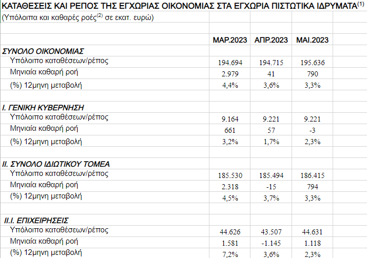 Αύξηση κατά 794 εκατ. ευρώ παρουσίασαν, το Μάιο του 2023, οι καταθέσεις του ιδιωτικού τομέα, έναντι μείωσης κατά 15 εκατ. ευρώ τον προηγούμενο μήνα, ενώ ο ετήσιος ρυθμός μεταβολής μειώθηκε σε 3,3% από 3,7% τον προηγούμενο μήνα.