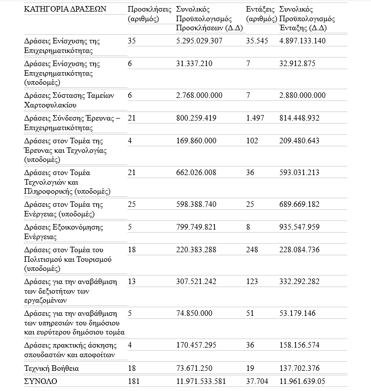 Προσκλήσεις: Έχουν εκδοθεί 181 ενεργές Προσκλήσεις συνολικού προϋπολογισμού (δημόσια δαπάνη) 11,97 δισ. ευρώ που αντιστοιχεί σε ποσοστό 144% επί του συνολικού προϋπολογισμού του Προγράμματος (8,298 δισ. ευρώ μετά την ενσωμάτωση τον Δεκέμβριο πόρων του REACT-EU για το 2022)