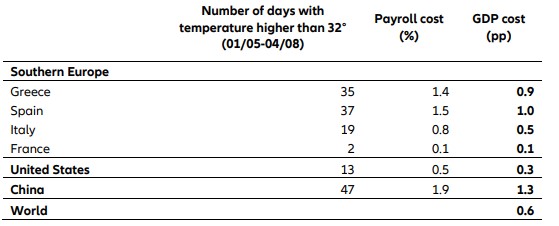 Ταυτόχρονα, «οι μισθωτοί που έχουν πληγεί από την ζέστη μειώνουν τις ώρες εργασίας τους, εμφανίζονται καθυστερήσεις και κάνουν σφάλματα. Η μείωση της παραγωγικότητας στην εργασία που προκαλούν οι ακραίες θερμοκρασίες είναι ένα πολύ γνωστό φαινόμενο».