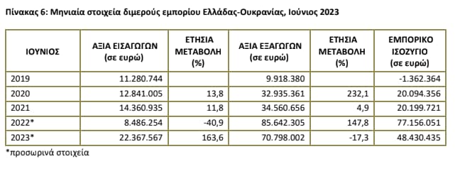 Η αξία των εξαγωγών της Ελλάδας προς την Ουκρανία τον Ιούνιο 2023 ανήλθε σε 70,8 εκατ. ευρώ, σημειώνοντας μείωση 17,3% σε σχέση με τον Ιούνιο 2022 που ήταν 85,6 εκατ. ευρώ. Το εμπορικό ισοζύγιο Ελλάδας-Ουκρανίας τον Ιούνιο 2023 ήταν θετικό και ανήλθε σε 48,4 εκατ. ευρώ (πλεόνασμα).
