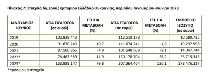 Την περίοδο Ιανουαρίου-Ιουνίου 2023 η αξία των εισαγωγών της Ελλάδας από την Ουκρανία ανήλθε σε 133,9 εκατ. ευρώ, σημειώνοντας αύξηση 79,8% σε σχέση με την περίοδο Ιανουαρίου-Ιουνίου 2022 που ήταν 74,5 εκατ. ευρώ. Η αξία των εξαγωγών της Ελλάδας προς την Ουκρανία την περίοδο Ιανουαρίου-Ιουνίου 2023 ανήλθε σε 307,4 εκατ. ευρώ, σημειώνοντας αύξηση 136,1% σε σχέση με την περίοδο Ιανουαρίου-Ιουνίου 2022 που ήταν 130,2 εκατ. ευρώ. Το εμπορικό ισοζύγιο Ελλάδας-Ουκρανίας την περίοδο Ιανουαρίου-Ιουνίου 2023 ήταν θετικό και ανήλθε σε 173,5 εκατ. ευρώ (πλεόνασμα).