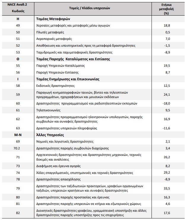 Αναλυτικότερα, στον τομέα των μεταφορών τη μεγαλύτερη αύξηση (18,8%), τη σημείωσαν οι χερσαίες μεταφορές και οι μεταφορές μέσω αγωγών. Στον τομέα παροχής καταλύματος και εστίασης και οι δύο υπηρεσίες κατέγραψαν μεγάλη άνοδο (19,5% και 8,7% αντίστοιχα).