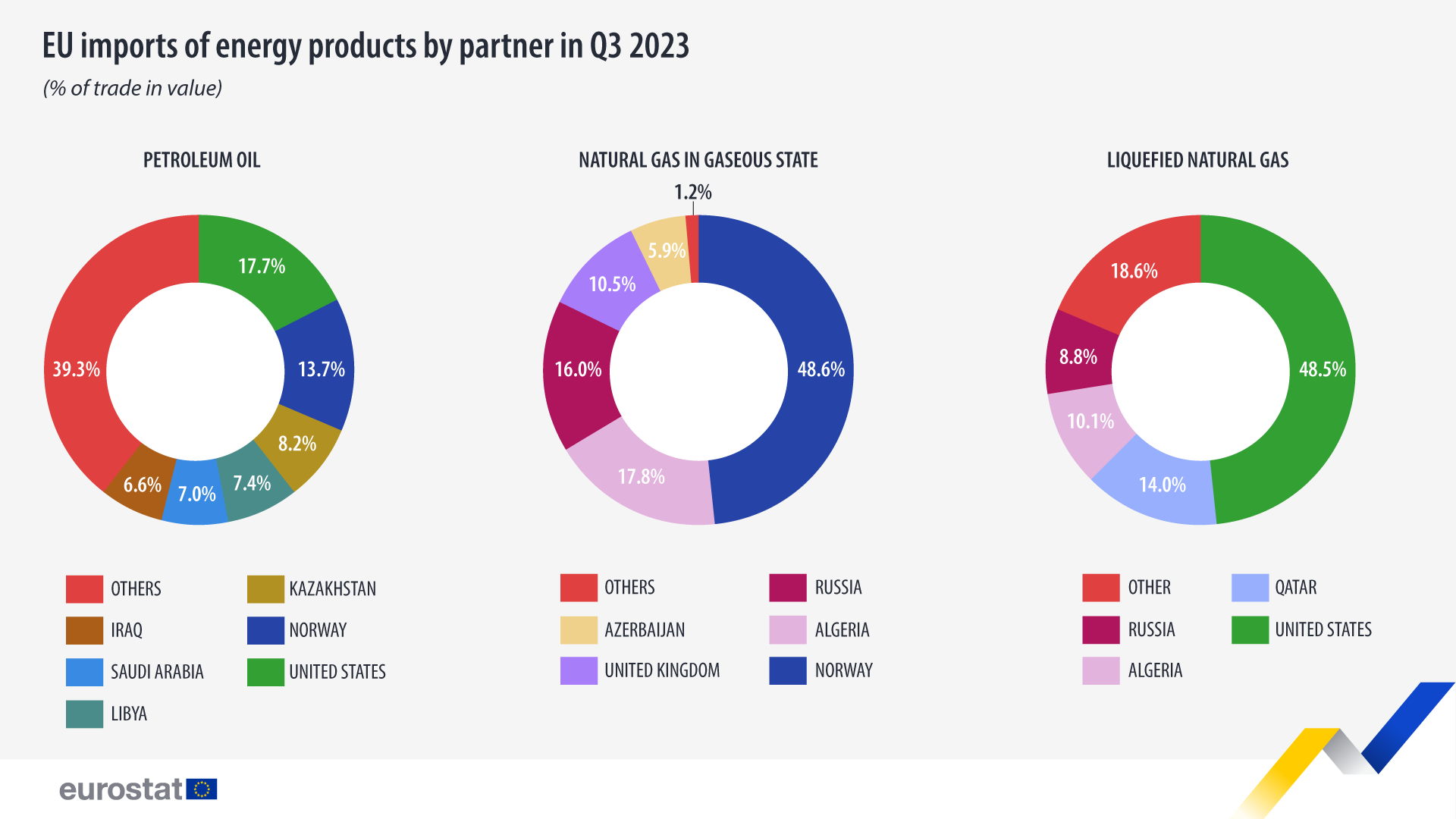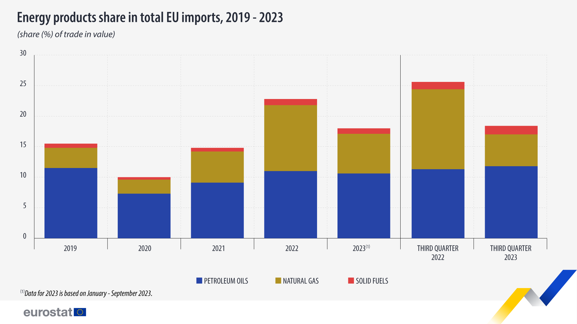 Το τρίτο τρίμηνο του 2022, η Ρωσία αντιπροσώπευε το 14,5% του συνόλου των εισαγωγών ενεργειακών προϊόντων της ΕΕ, ενώ το αντίστοιχο διάστημα το 2023 αντιπροσώπευε το 6,5%.
