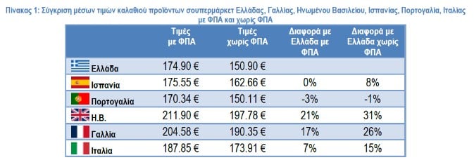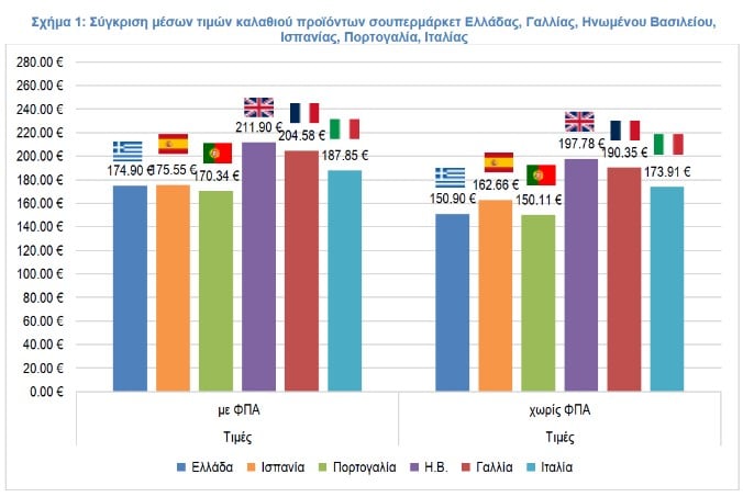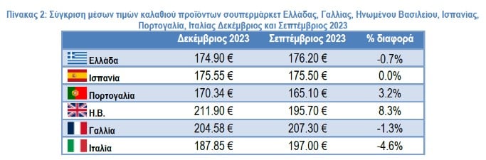 Παραμένουν χαμηλότερες οι τιμές του τυπικού καλαθιού του νοικοκυριού στα ελληνικά σούπερ μάρκετ σε σχέση με τη Γαλλία, την Αγγλία, την Ιταλία και την Ισπανία, αλλά είναι υψηλότερες από την Πορτογαλία.