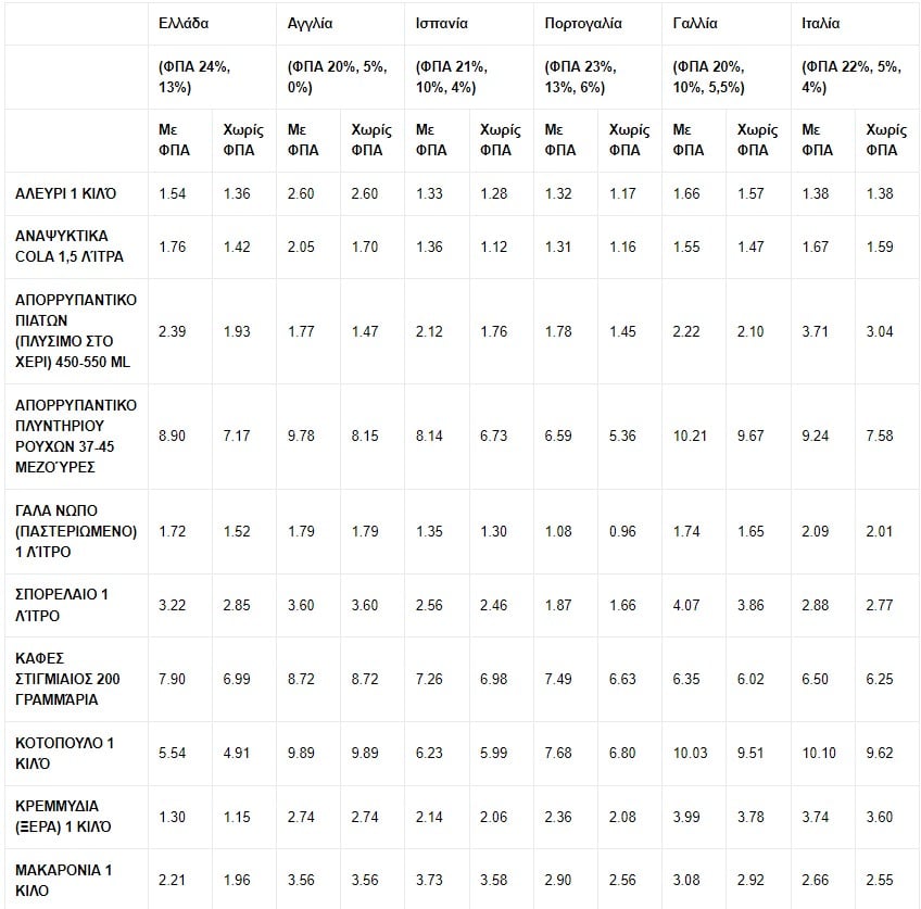 Στην Ελλάδα αυτός ο ΦΠΑ είναι 13%. Ο ΦΠΑ είναι σημαντικά υψηλότερος από το Ηνωμένο Βασίλειο (0% ή 5%) και τη Γαλλία (10% και 5,5%), την Ισπανία (10% και 4%), την Πορτογαλία (13% και 6%), την Ιταλία (5% και 4%), αλλά και τις περισσότερες χώρες της ΕΕ. Η βασική διαφορά είναι ότι τρόφιμα που στην Ελλάδα υπάγονται στον υψηλό συντελεστή ΦΠΑ με 24% στις υπόλοιπες χώρες υπάγονται στον χαμηλό συντελεστή ΦΠΑ, ο οποίος είναι και χαμηλότερος του ελληνικού με 6%, 5,5%, 4% ή ακόμα και 0%. Σημειώνεται ότι η επίδραση ειδικών φόρων κατανάλωσης (π.χ. καφές) δεν είναι δυνατόν να συνυπολογιστεί στα παραπάνω στοιχεία.