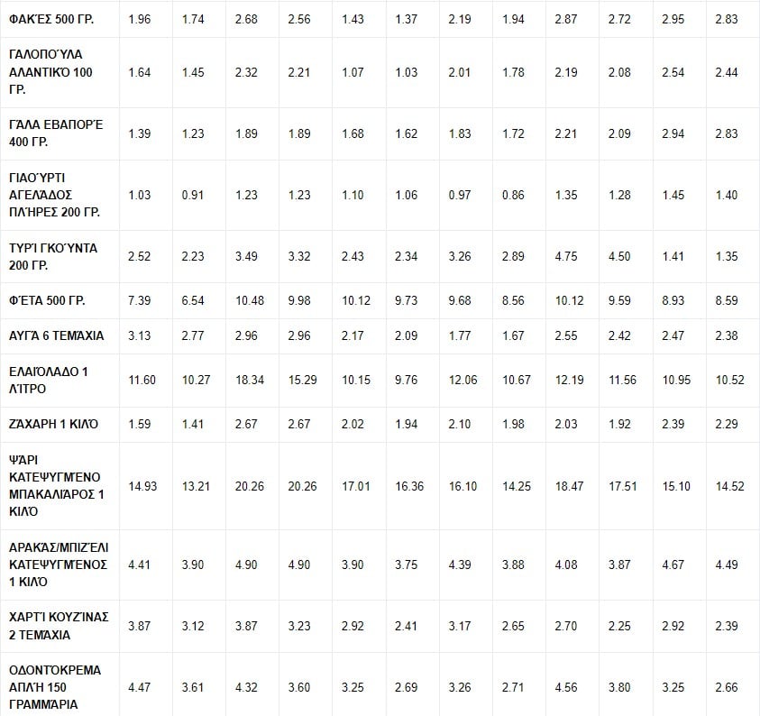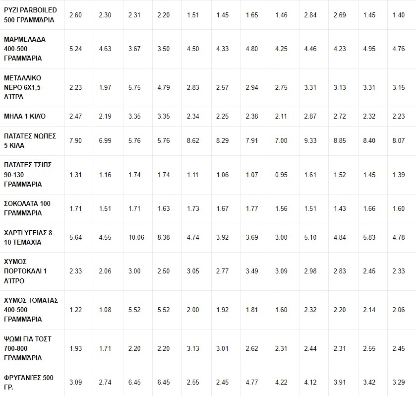 Τα στοιχεία προέρχονται από τις παρακάτω αλυσίδες σουπερμάρκετ, ενώ οι μέσες τιμές ανά υποκατηγορία και ανά χώρα παρουσιάζονται στον πίνακα 3: