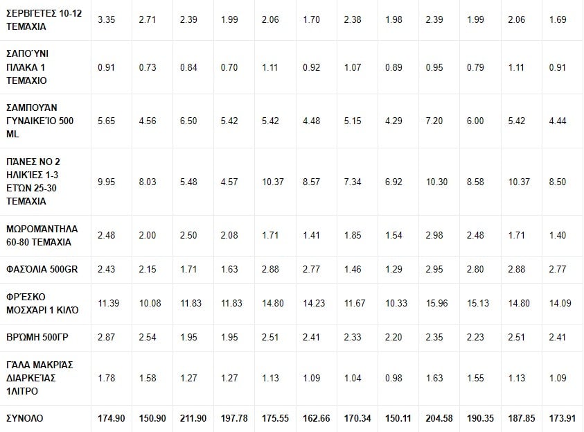 Για την παρούσα ανάλυση συγκρίθηκαν οι τιμές σε συνολικά 44 κατηγορίες προϊόντων: