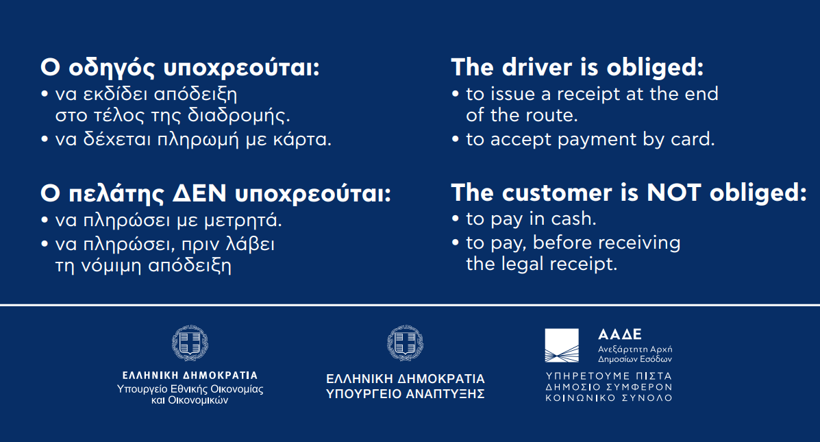 Σύμφωνα με την απόφαση, πρόκειται για ένα ειδικό αυτοκόλλητο, το οποίο τοποθετείται στο τζάμι της πίσω δεξιάς πόρτας του οχήματος, και αναγράφει στα ελληνικά και στα αγγλικά τα εξής: Ο οδηγός υποχρεούται: Να εκδίδει απόδειξη στο τέλος της διαδρομής. Να δέχεται πληρωμή με κάρτα. Ο πελάτης ΔΕΝ υποχρεούται: Να πληρώσει με μετρητά. Να πληρώσει, πριν λάβει τη νόμιμη απόδειξη.