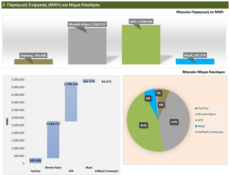 Μια άλλη ενδιαφέρουσα παρατήρηση αφορά στην υψηλή συμμετοχή των ΑΠΕ στο ηλεκτροπαραγωγικό μίγμα, που έφθασε στο 45%, ενώ αν προσθέσουμε και τη συμμετοχή των νερών (βλέπε υδροηλεκτρικά έργα), η συνολική συμμετοχή των ανανεώσιμων μορφών ενέργειας φθάνει το 51%, που θεωρείται ένα από τα υψηλότερα για ευρωπαϊκή χώρα.