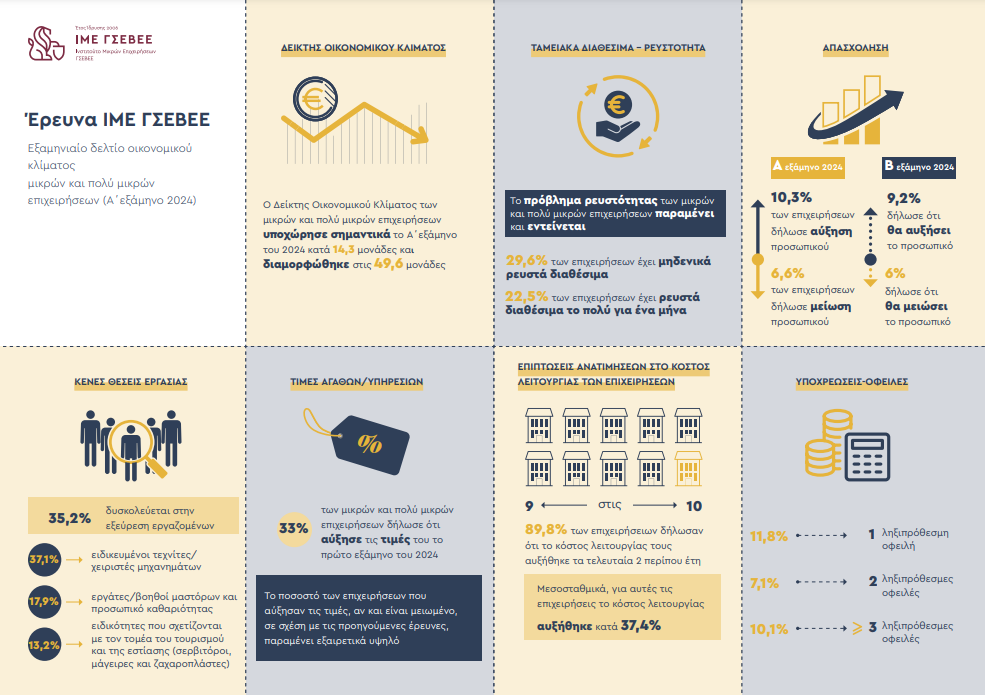 «Ο Δείκτης Οικονομικού Κλίματος των μικρών και πολύ μικρών επιχειρήσεων το Α΄ εξάμηνο του 2024 παρουσιάζει σημαντική υποχώρηση κατά 14,3 μονάδες σε σχέση με το προηγούμενο εξάμηνο. Συγκεκριμένα, διαμορφώνεται στις 49,6 μονάδες από τις 63,9 που ήταν το Β΄ εξάμηνο του 2023. Η σοβαρή αυτή υποχώρηση υποδηλώνει την αβεβαιότητα που κυριαρχεί κυρίως λόγω της επίμονης πληθωριστικής κρίσης.