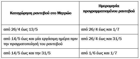 Οφείλουν να δηλώσουν έως 31/5 το σύνολο των ραντεβού τους, ανάλογα με τον χρόνο υλοποίησής τους, ακολουθώντας το παρακάτω χρονοδιάγραμμα: