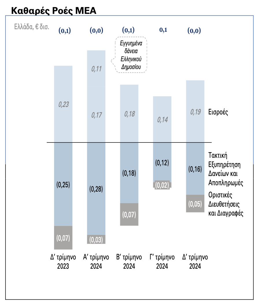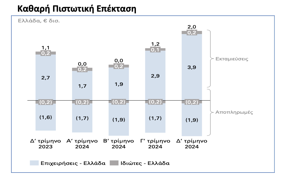 Η καθαρή πιστωτική επέκταση για το 2024 ανήλθε σε 3,2 δισ. ευρώ, προερχόμενη κυρίως από επιχειρήσεις, υπερβαίνοντας κατά πολύ τον αναθεωρημένο στόχο για 2 δισ ευρώ νέες εκταμιεύσεις, καθώς οι νέες εκταμιεύσεις αυξήθηκαν κατά 31% σε ετήσια βάση.