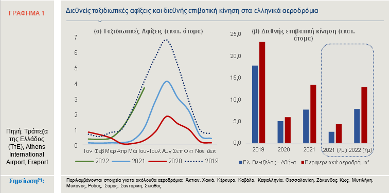 Το πρώτο εξάμηνο του 2022, επισκέφθηκαν την Ελλάδα σχεδόν 8 εκατομμύρια ταξιδιώτες από το εξωτερικό, ενώ οι ταξιδιωτικές εισπράξεις ανήλθαν σε ευρώ 5,1 δισ., με τα εν λόγω μεγέθη να υπολείπονται σε σύγκριση με το 2019 κατά 15% και 5,3%, αντίστοιχα. Επιπρόσθετα η μέση δαπάνη ανά ταξίδι ήταν αυξημένη σε σύγκριση με το διάστημα Ιανουαρίου-Ιουλίου 2019 κατά 12,6%.
