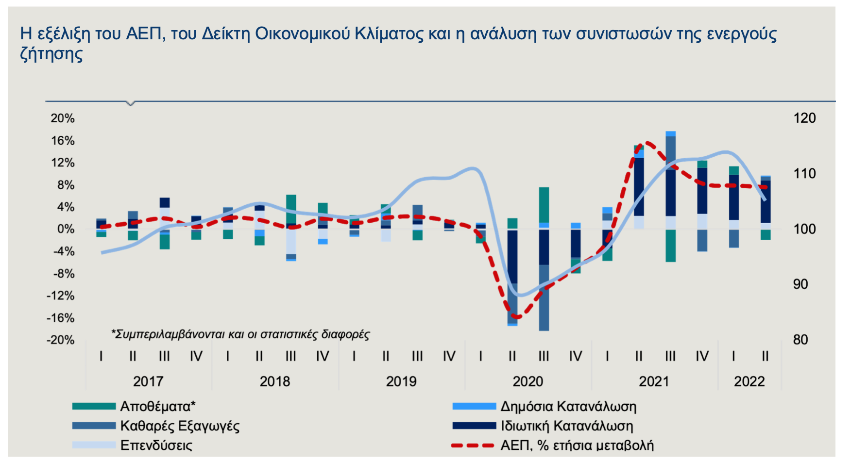Η ιδιωτική κατανάλωση αποτέλεσε τον βασικότερο πυλώνα της οικονομικής μεγέθυνσης, καθώς αυξήθηκε κατά 11,4% το πρώτο εξάμηνο του 2022, συνεισφέροντας 7,9 ποσοστιαίες μονάδες (π.μ.) στην αύξηση του ΑΕΠ. Οι επενδύσεις και η δημόσια κατανάλωση αυξήθηκαν κατά 10,9% και 0,3% αντίστοιχα, συμβάλλοντας κατά 1,4 και 0,1 π.μ. στην αύξηση του ΑΕΠ, ενώ αντίθετα, αρνητική συνεισφορά είχαν τόσο οι καθαρές εξαγωγές (- 1,3 π.μ.), όσο και τα αποθέματα (-0,2 π.μ.). Σημειώνεται, ωστόσο, ότι το δεύτερο τρίμηνο οι καθαρές εξαγωγές είχαν θετική συνεισφορά στην αύξηση του ΑΕΠ, καθώς οι εξαγωγές αγαθών και υπηρεσιών (20,8%) αυξήθηκαν περισσότερο από τις αντίστοιχες εισαγωγές (15,5%), με τις εξαγωγές υπηρεσιών να καταγράφουν εντυπωσιακή αύξηση κατά 47,4% σε ετήσια βάση, αντανακλώντας τις ισχυρές επιδόσεις του τουρισμού.