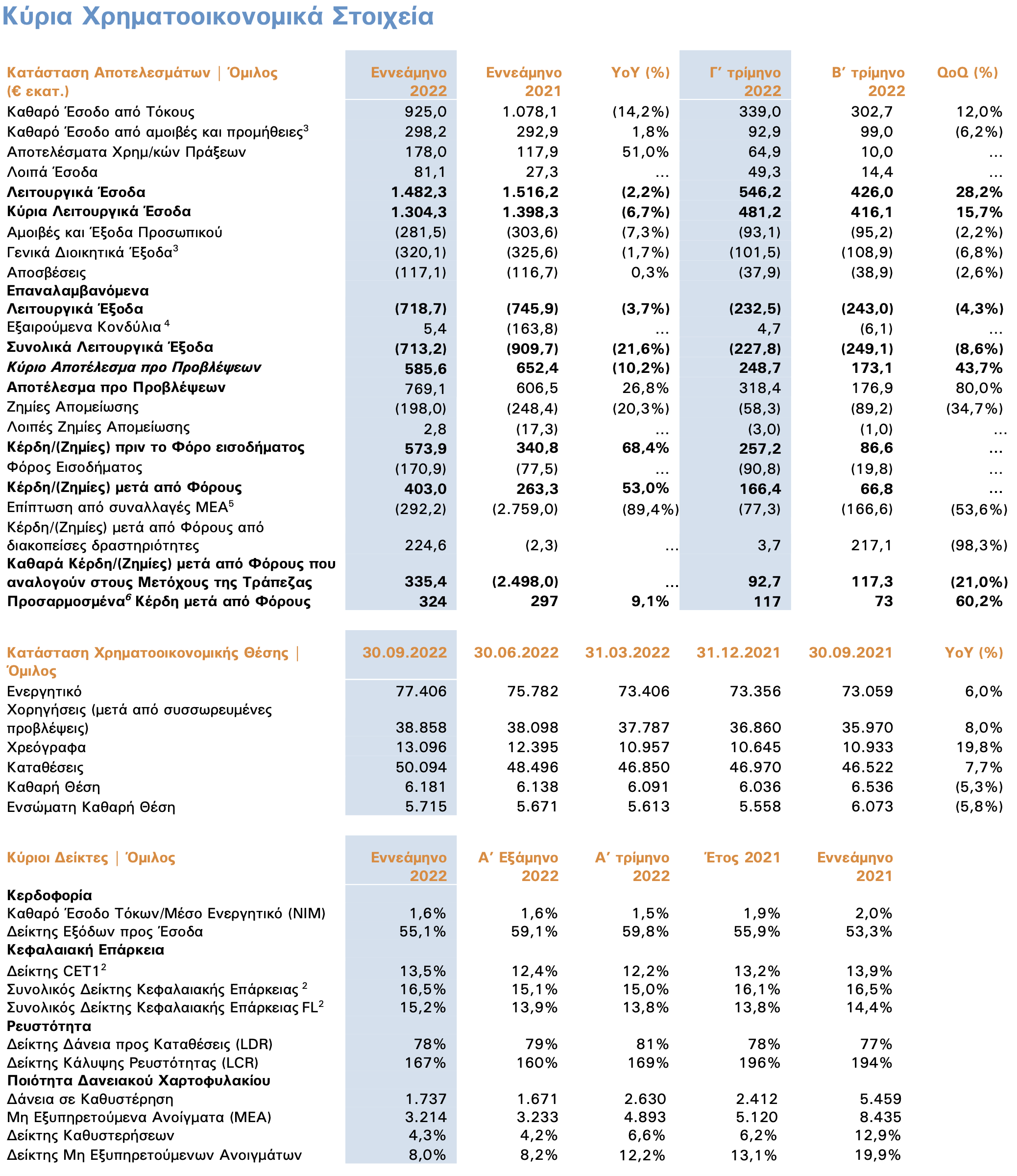 Κατά το Εννεάμηνο του έτους, επιτύχαμε κερδοφορία ύψους €335 εκατ., επίδοση που μας επιτρέπει να βελτιώσουμε τις εκτιμήσεις μας για την κερδοφορία της Τράπεζας το 2022 σε 7%. Το καθαρό έσοδο τόκων αυξήθηκε κατά 12% σε τριμηνιαία βάση, τροφοδοτούμενο σε μεγάλο βαθμό από την αύξηση των χρηματοδοτήσεων, καθώς εδραιώσαμε τη θέση μας ως ο βασικός χρηματοδότης των ελληνικών επιχειρήσεων, με το χαρτοφυλάκιο εξυπηρετούμενων δανείων της Τράπεζας να διαμορφώνεται πλέον σε €30,7 δισ., επιτυγχάνοντας ήδη τον ετήσιο στόχο για τα επιχειρηματικά δάνεια.
