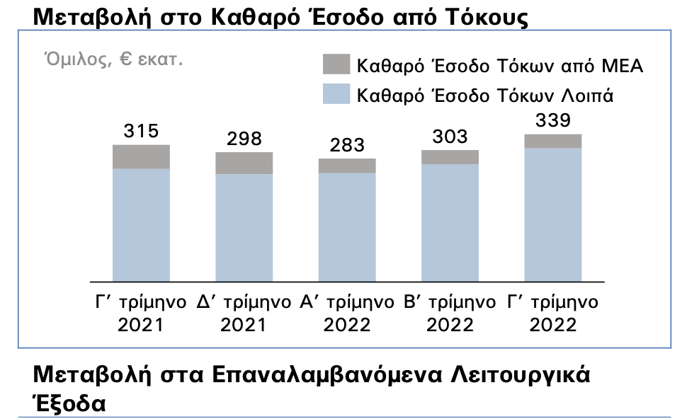 - Σε επαναλαμβανόμενη βάση, το Καθαρό Έσοδο Τόκων αυξήθηκε κατά 17% σε σχέση με το προηγούμενο τρίμηνο, λόγω της αύξησης των χορηγήσεων δανείων, των υψηλότερων εσόδων από το χαρτοφυλάκιο των ομολόγων καθώς και την θετική επίπτωση από την αύξηση των επιτοκίων. Αναμένεται περαιτέρω αύξηση στο Καθαρό Έσοδο Τόκων λόγω της δυναμικής του ισολογισμού και των μακροοικονομικών εξελίξεων, ακόμη και κάτω από συντηρητικές παραδοχές.