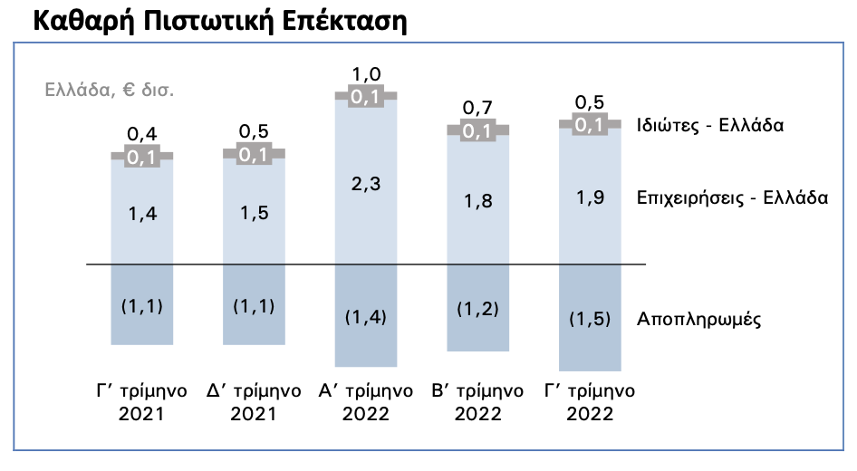 - Η εγχώρια καθαρή πιστωτική επέκταση διαμορφώθηκε σε €0,5 δισ., ως αποτέλεσμα νέων εκταμιεύσεων, κυρίως Επιχειρηματικών δανείων, με την καθαρή πιστωτική επέκταση προς Επιχειρήσεις να ανέρχεται σε €2,2 δισ. το εννεάμηνο του 2022.