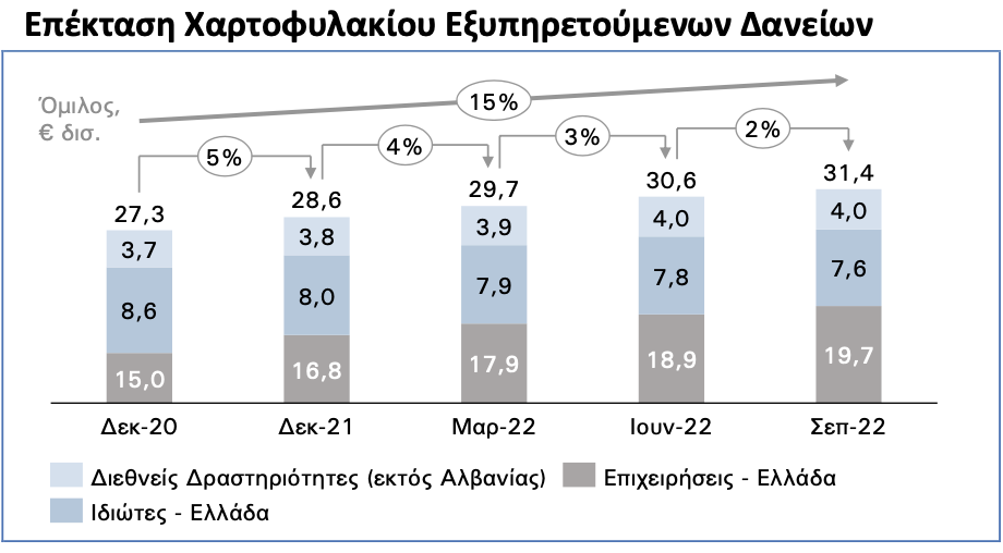 - Το χαρτοφυλάκιο Εξυπηρετούμενων Δανείων αυξήθηκε κατά 2% σε τριμηνιαία βάση και ανήλθε σε Ευρώ 31,4 δισ. (+9% σε ετήσια βάση) ως αποτέλεσμα καθαρής πιστωτικής επέκτασης ύψους Ευρώ 0,5 δισ. προς Επιχειρήσεις. Ο στόχος που είχε τεθεί για το 2022 έχει επιτευχθεί ήδη από το εννεάμηνο, επιβεβαιώνοντας την ηγετική θέση της Τράπεζας στον τομέα πιστοδοτήσεων Επιχειρήσεων.