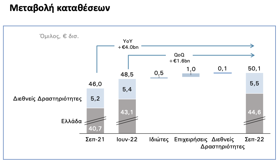Οι συνολικές καταθέσεις του Ομίλου αυξήθηκαν κατά €1,6 δισ. σε τριμηνιαία βάση και διαμορφώθηκαν σε €50,1 δισ. λόγω εισροών καταθέσεων πρώτης ζήτησης από Επιχειρήσεις και νοικοκυριά, συμβάλλοντας στην χρηματοδότηση της επέκτασης του δανειακού χαρτοφυλακίου. Οι καταθέσεις πρώτης ζήτησης αποτελούν σε ποσοστό το 86% των συνολικών καταθέσεων (81% το γ’ τρίμηνο 2021).