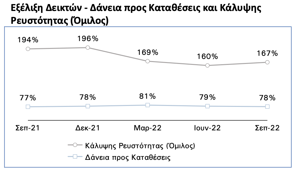 Η ισχυρή ρευστότητα αντικατοπτρίζεται στον Δείκτη Δανείων προς Καταθέσεις, ο οποίος βελτιώθηκε περαιτέρω και ανήλθε σε 78%, ενώ, σε επίπεδο Ομίλου, ο Δείκτης Κάλυψης Ρευστότητας (LCR) ανήλθε σε 167%, ποσοστό αρκετά υψηλότερο του εποπτικού ορίου.