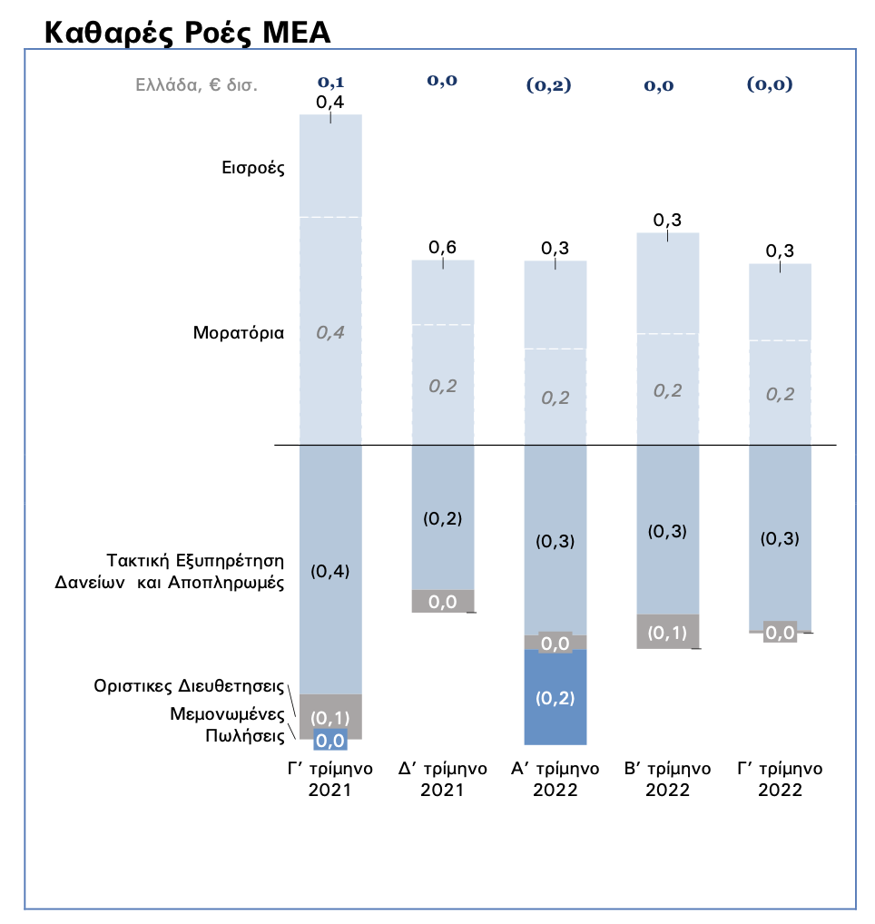 - Το Κόστος Πιστωτικού Κινδύνου διαμορφώθηκε σε 61 μονάδες βάσης, λαμβανομένων υπόψη των ζημιών απομείωσης ύψους €39 εκατ., ως αποτέλεσμα της σταθερής επίδοσης των καθαρών ροών ΜΕΑ που καταγράφηκε το γ’ τρίμηνο, καθώς και των εξόδων διαχείρισης καθυστερήσεων €19 εκατ. Το Εννεάμηνο 2022, το κόστος πιστωτικού κινδύνου ανήλθε σε 70 μονάδες βάσης.