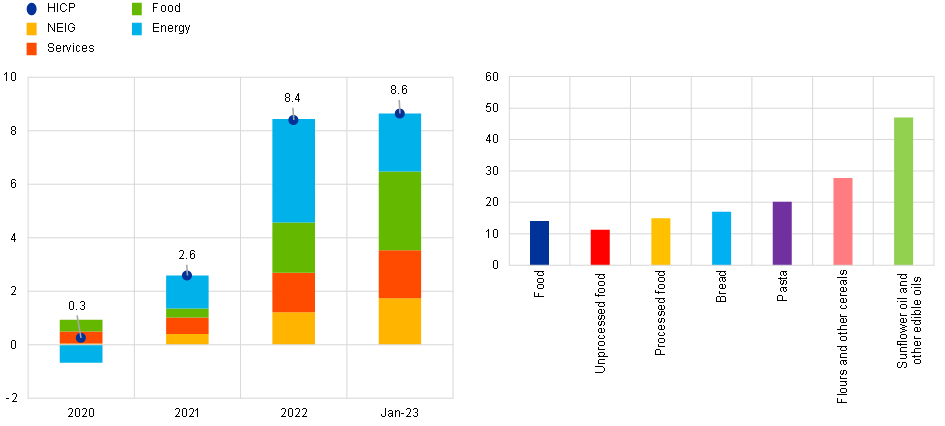 Ετσι, από 0,3% το 2020 ο γενικός πληθωρισμός αυξήθηκε σε 2,6% το 2021 και σε 8,4% το 2022, με τον πληθωρισμό της ενέργειας και των τροφίμων να αντιπροσωπεύει περισσότερα από τα 2/3 το πληθωρισμού ρεκόρ.