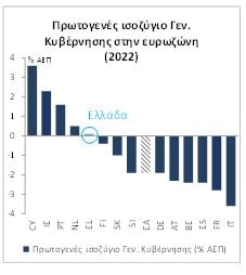 Η επίτευξη μικρού πρωτογενούς πλεονάσματος 0,1% του ΑΕΠ σε επίπεδο Γενικής Κυβέρνησης το 2022 -- έναν χρόνο νωρίτερα από το προγραμματισμένο, έναντι εκτίμησης του Προϋπολογισμού για πρωτογενές έλλειμμα 1,6% του ΑΕΠ -- και η σημαντική μείωση του Δημόσιου Χρέους σύμφωνα με την 1η εκτίμηση από την ΕΛΣΤΑΤ δημιουργούν ευνοϊκή δυναμική για το 2023, σημειώνει σε έκθεσή της η Εθνική Τράπεζα.