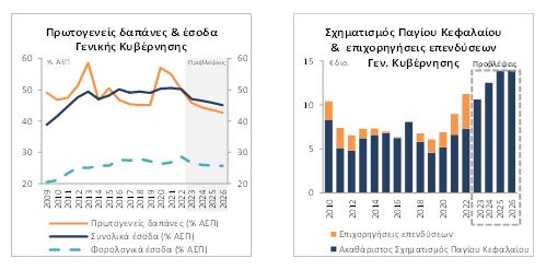 Αντιστοίχως, η ανάλυση της ΕΤΕ εκτιμά ότι το δημοσιονομικό αποτέλεσμα του 2023 από την πλευρά των δαπανών θα μπορούσε να είναι ακόμη καλύτερο από το προβλεπόμενο στο ΠΣ2023. Συγκεκριμένα, οι πρωτογενείς δαπάνες αναμένεται να μειωθούν σε 42,7% του ΑΕΠ έως το τέλος του 2026, σχεδόν 0,5 ποσοστιαίες μονάδες χαμηλότερα από την αντίστοιχη πρόβλεψη του ΠΣ2023.