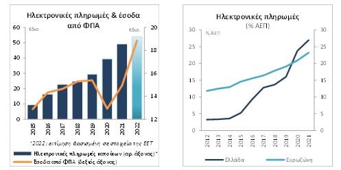 Σε αυτή την κατεύθυνση, κομβικός είναι ο ρόλος των εκθετικά αυξανόμενων ηλεκτρονικών συναλλαγών, οι οποίες συνέτειναν στη διεύρυνση της φορολογικής βάσης, με περιορισμό της άτυπης/αδήλωτης δραστηριότητας που μεταφράστηκε σε αυξημένη ελαστικότητα των φορολογικών εσόδων ως προς τις μεταβολές της οικονομικής δραστηριότητας στην οικονομία (ειδικά όσον αφορά τους έμμεσους φόρους). Στην πραγματικότητα, οι ηλεκτρονικές συναλλαγές, ως ποσοστό του ΑΕΠ, υπερ-πενταπλασιάστηκαν στην Ελλάδα την προηγουμένη επταετία, από 5% το 2015 σε περίπου 27% του ΑΕΠ (σωρευτική άνοδος περίπου €50 δισ.), με την πανδημία του Covid-19 να μεταβάλει ακόμη πιο έντονα τις συναλλακτικές συνήθειες και την Ελλάδα να υπερβαίνει το σχετικό μέσο όρο για την ευρωζώνη από το 2020. Τα σημαντικά περιθώρια πρόσθετης αξιοποίησης της ανωτέρω δυναμικής, προκειμένου να επιτευχθεί περαιτέρω διεύρυνση της φορολογικής βάσης, συνιστούν πρόκληση αλλά και σημαντική ευκαιρία για δημιουργία διατηρήσιμου δημοσιονομικού χώρου.