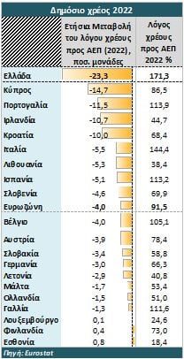 Τέλος, αξίζει να σημειωθεί ότι η Ελλάδα πέτυχε την ταχύτερη μείωση στο λόγο δημόσιου χρέους ως προς ΑΕΠ, που ανήλθε στις 23,3 ποσοστιαίες μονάδες το 2022, έναντι 4% του ΑΕΠ για την ευρωζώνη. Πιο συγκεκριμένα, το ακαθάριστο δημόσιο χρέος ως προς το ΑΕΠ της Ελλάδας παρέμεινε σε έντονα πτωτική τροχιά για 2ο συνεχή χρόνο, μειούμενο στο 171,3% το 2022, από 194,6% το 2021 και 206,3% το 2020, στο χαμηλότερο σημείο από το 2012.