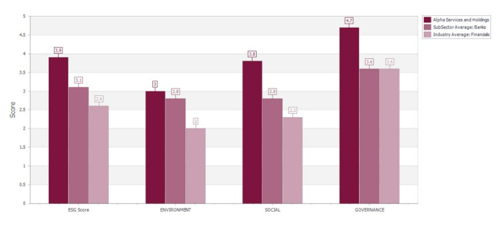 Σύμφωνα με τη σχετική έκθεση αξιολόγησης, η Alpha Services and Holdings αύξησε τη συνολική της βαθμολογία από το 3,7 στο 3,9, ξεπερνώντας σημαντικά τον μέσο όρο βαθμολογίας των οργανισμών που δραστηριοποιούνται στον τραπεζικό αλλά και γενικότερα στον χρηματοοικονομικό κλάδο.