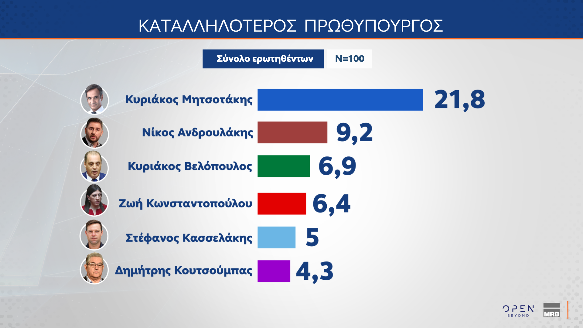 Ως προς τη σειρά καταγράφουν και οι αρχηγοί των κομμάτων. 21,8% των ερωτηθέντων της δημοσκόπησης απαντούν πως καταλληλότερος πρωθυπουργός είναι ο Κυριάκος Μητσοτάκης, ακολουθούν ο Νίκος Ανδρουλάκης με 9,2%, ο Κυριάκος Βελόπουλος με 6,9%, η Ζωή Κωνσταντοπούλου με 6,4 και ο Στέφανος Κασσελάκηςμε 5%.