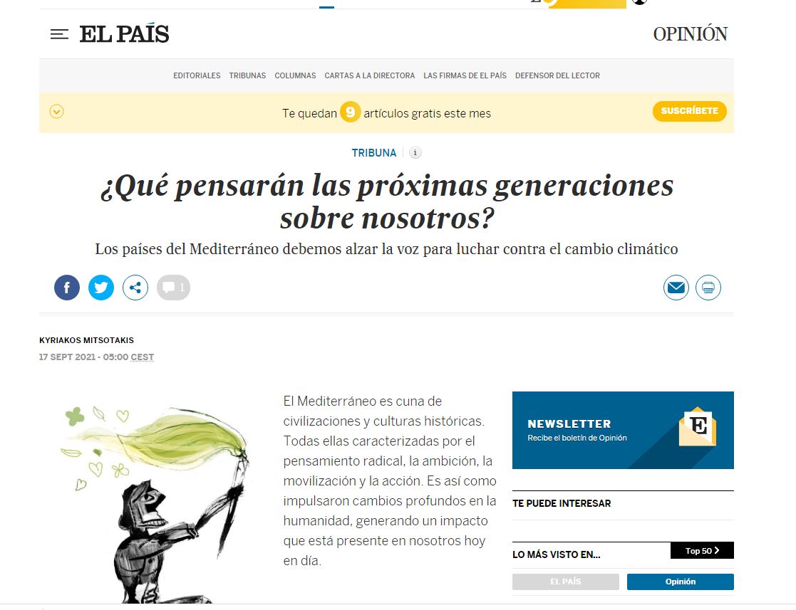 Το άρθρο του κ. Μητσοτάκη, με τίτλο «Τι θα σκεφτούν για εμάς; Το πράσινο μήνυμα από την Αθήνα για τη Μεσόγειο», αναφέρεται εκτενώς στις καταστροφές που βιώνει ο πλανήτης εξαιτίας της κλιματικής κρίσης και τονίζει ότι πρέπει να ληφθούν εγκαίρως μέτρα, επισημαίνοντας ότι η Σύνοδος Κορυφής των κρατών μελών του νότου της ΕΕ καλείται να εισηγηθεί λύσεις, οι οποίες δεν θα αφορούν μόνον τον ιστορικό του μέλλοντος, όσο την παρούσα και τις επόμενες γενιές.