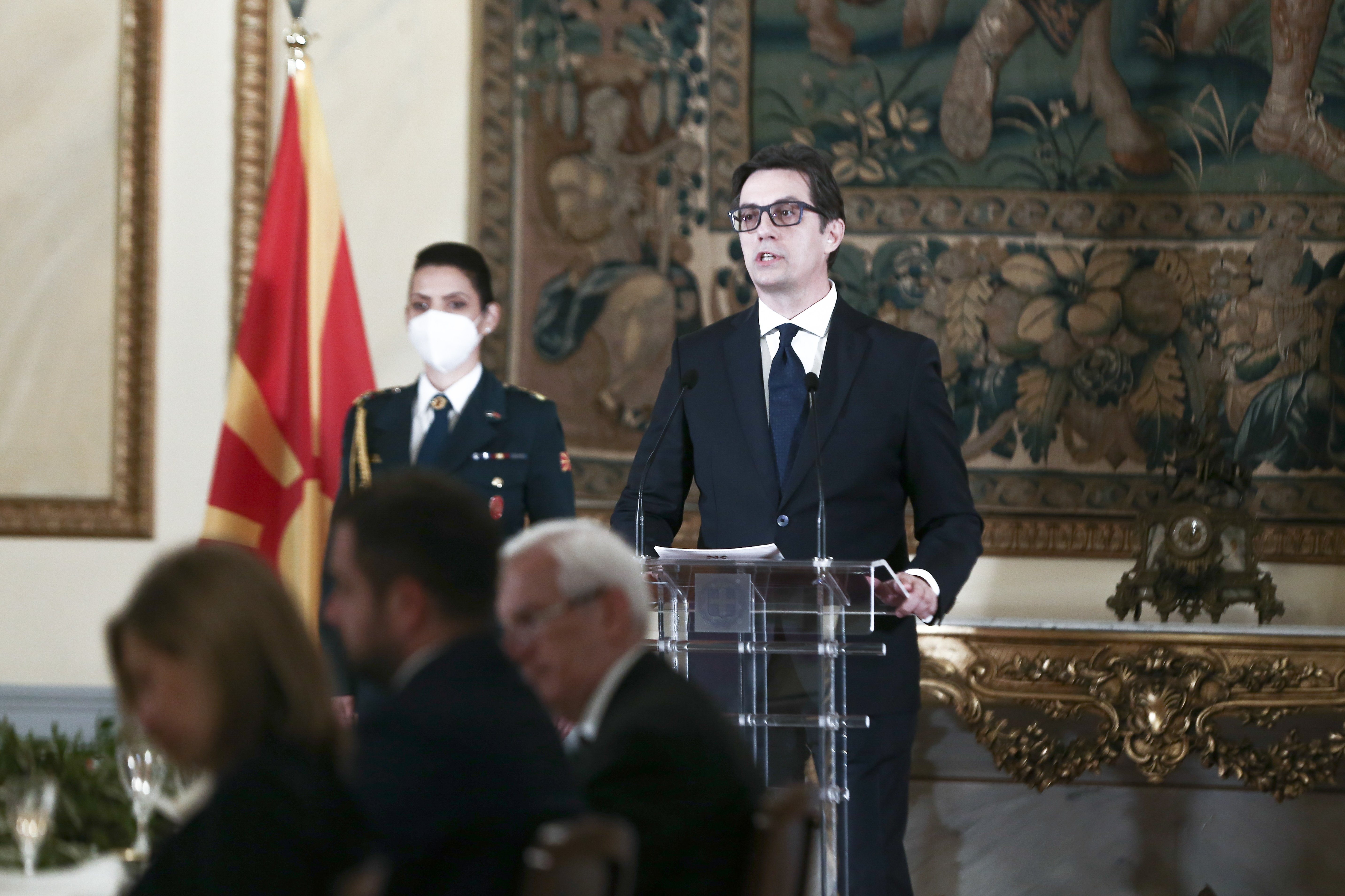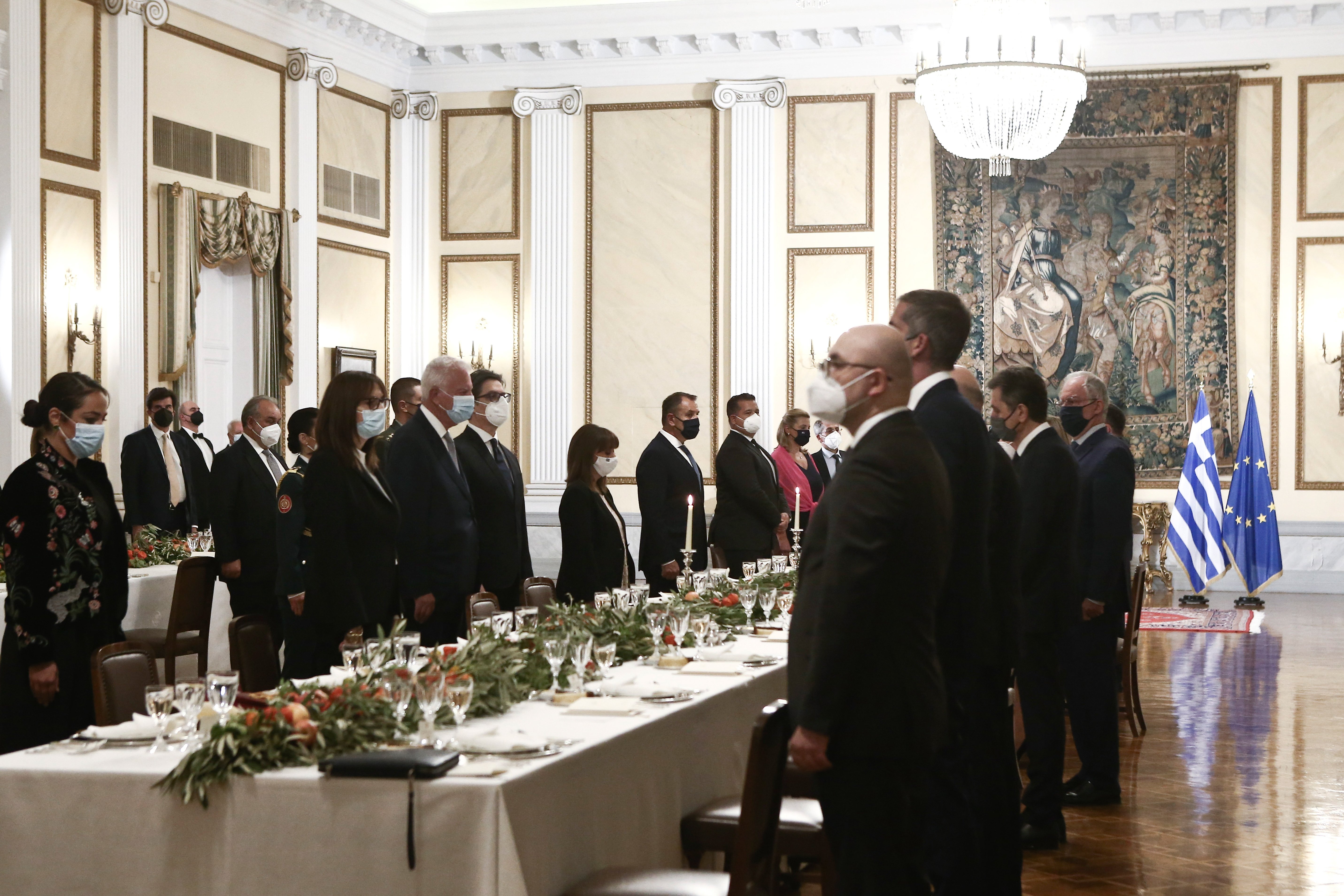 Eπίσημο δείπνο προς τιμήν του Προέδρου της Βόρειας Μακεδονίας Στέβο Πενταρόφσκι, παρέθεσε απόψε η Πρόεδρος της Δημοκρατίας, Κατερίνα Σακελλαροπούλου, στο Προεδρικό Μέγαρο, παρουσία του Aντιπροέδρου της Κυβέρνησης Παναγιώτη Πικραμμένου, του Προέδρου της Βουλής, Κωνσταντίνου Τασούλα, του Τομεάρχη Εξωτερικών του ΣΥΡΙΖΑ, βουλευτή Γιώργου Κατρούγκαλου, Υπουργών της Κυβέρνησης, του Δημάρχου Αθηναίων Κώστα Μπακογιάννη, διπλωματών και επιχειρηματιών.