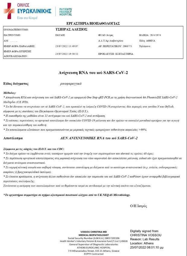 Μάλιστα δημοσιοποίησε το αρνητικό PCR του Αλέξη Τσίπρα.